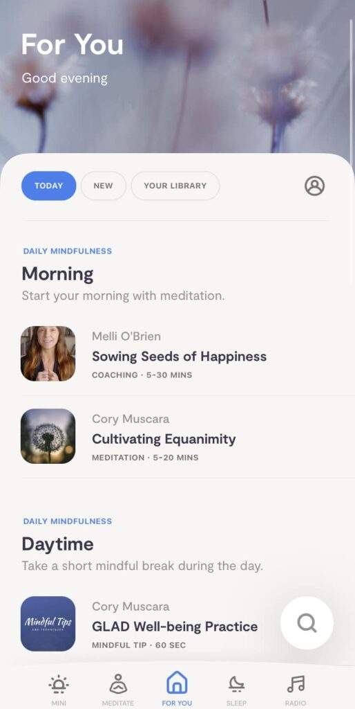 界面包括五个标签:Mini,您可以在其中找到全天随时进行的快速简单的正念练习;Meditate,您可以在这里找到应用程序的所有2,000多个引导冥想;Sleep,包含有助于深度睡眠的放松冥想;Radio,提供有助于专注和冷静的正念音乐和声音景观;最后是For You标签,这正是让这个应用程序脱颖而出的地方。