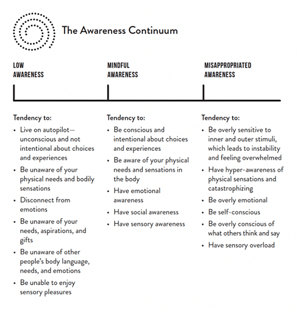 觉知是我们观察外在世界和内在自我而不加评判的能力;这包括我们的身体、感受、想法、心理习惯以及我们重视的事物。例如,当你注意到这些你正在阅读的文字时,你是否也意识到你的呼吸正进出你的身体?你的体态是否支持你在警觉和放松之间找到平衡?也许你注意到身体的某个部位紧绷,呼吸变得浅促。现在你已经意识到自己的呼吸和身体,你可以放松那些紧张的地方,并让呼吸变得更深一些。通过返回到你的觉知,你可以打破自动驾驶的习惯,获得对如何回应情境的更多控制。你正在重新夺回对自己的所有权。