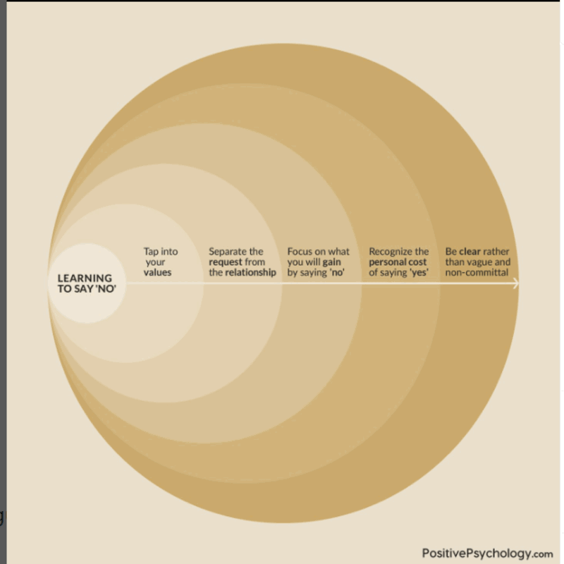 Greg McKeown在他的书《少即是精:有选择的专注》中提出了说“不”以增加有价值的生活的概念。McKeown 建议我们可以优雅地说“不”以优先考虑做对我们有益的事情。然而,说“不”往往说起来容易做起来难。