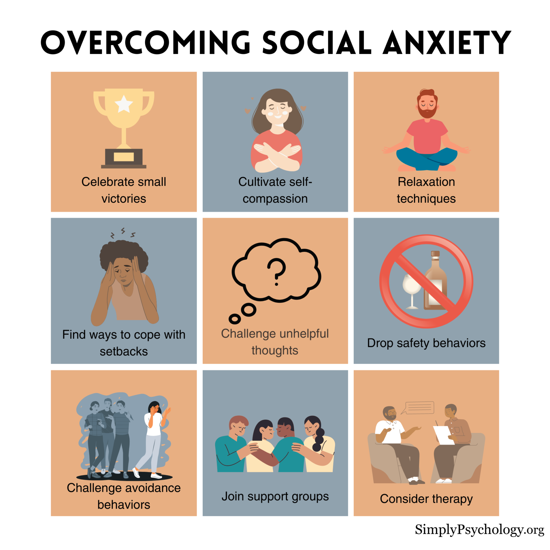 放弃安全行为时,短期内你可能会感到更加焦虑。但是,与回避行为一样,你越努力推动自己,长期来看你应该会感到更加舒适,并更好地应对社交场合。